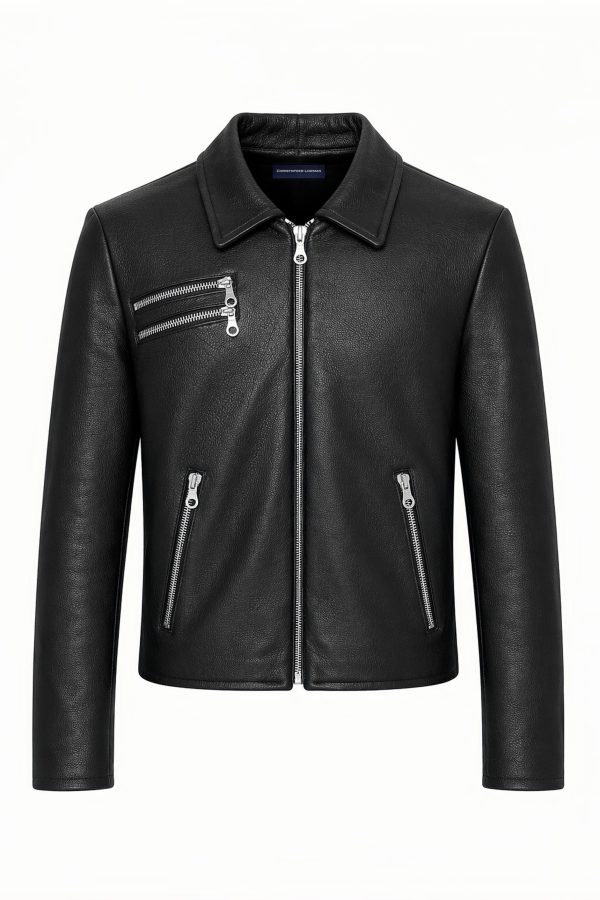 This Genuine Italian Lambskin Leather Worker Jacket is crafted from premium lambskin leather with a deep black gloss finish, developed using an exclusive aluminum-based treatment designed specifically for leather. The result is a refined surface with subtle sheen and enhanced durability.