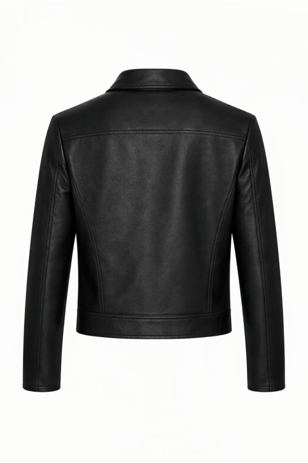 This leather biker jacket is crafted from premium smooth leather and cut in a cropped, structured silhouette that balances classic moto attitude with modern precision. The design features an asymmetrical front zip, sharp lapels with snap detailing, and a streamlined body that delivers a strong, architectural profile.