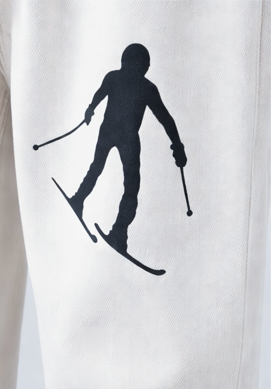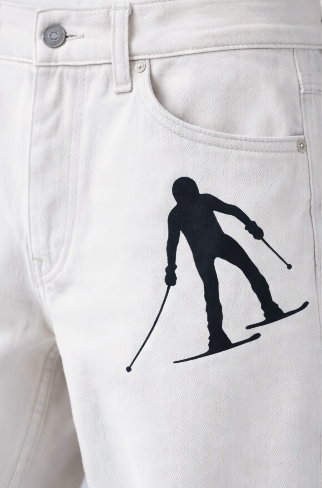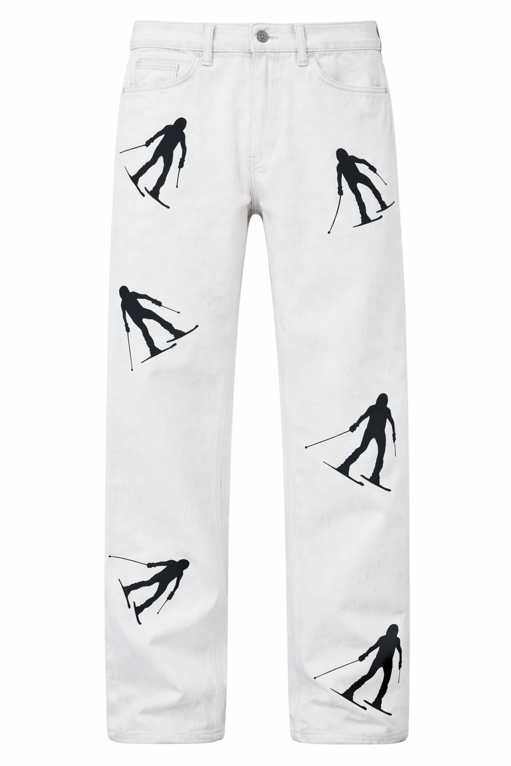 Designed with a clean, straight-leg silhouette, the piece is elevated through the placement of six skier graphics—three on each leg—creating movement and rhythm across the garment. The contrast between the light-washed denim and bold black artwork delivers a sharp, modern statement grounded in alpine influence.