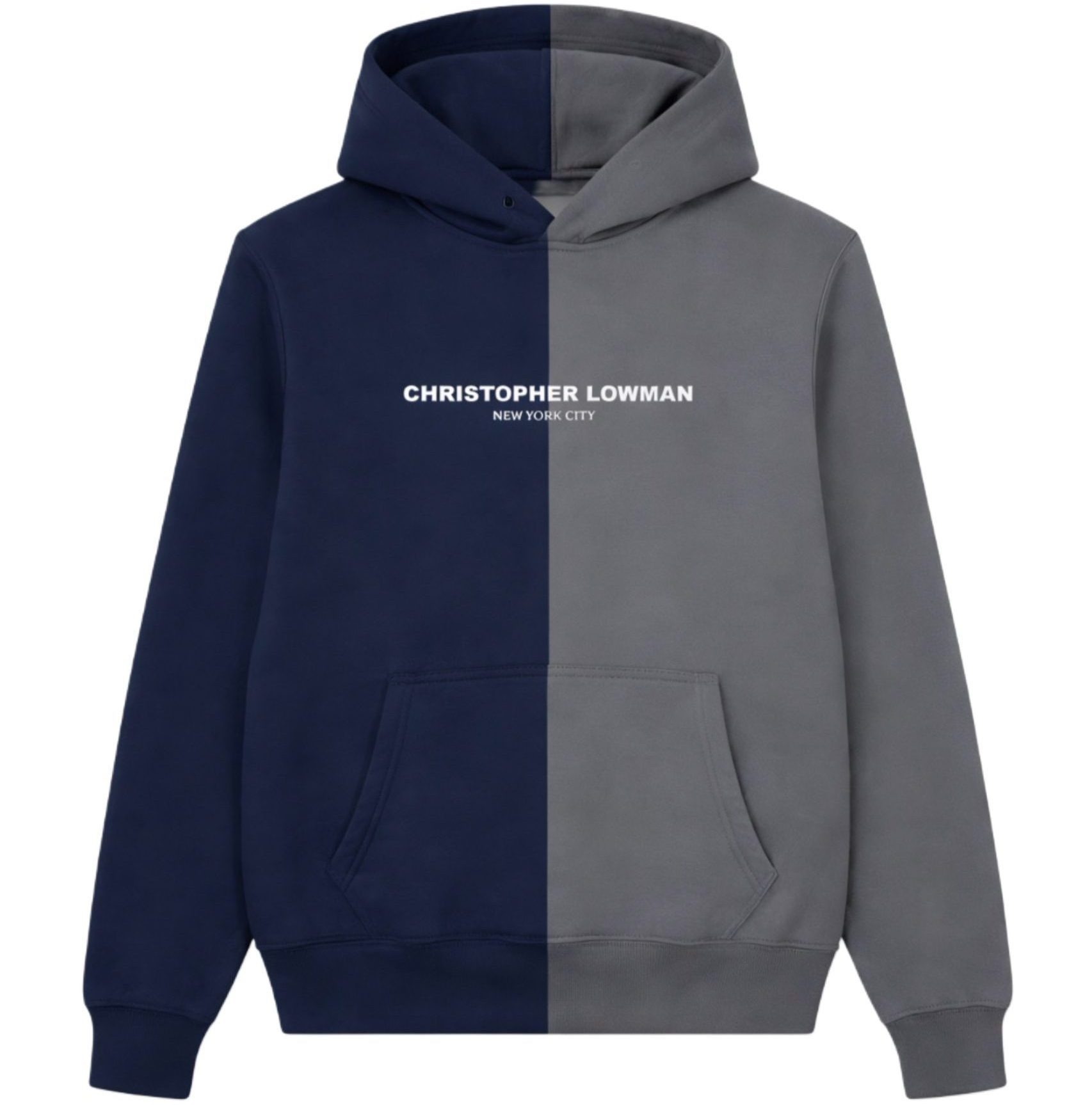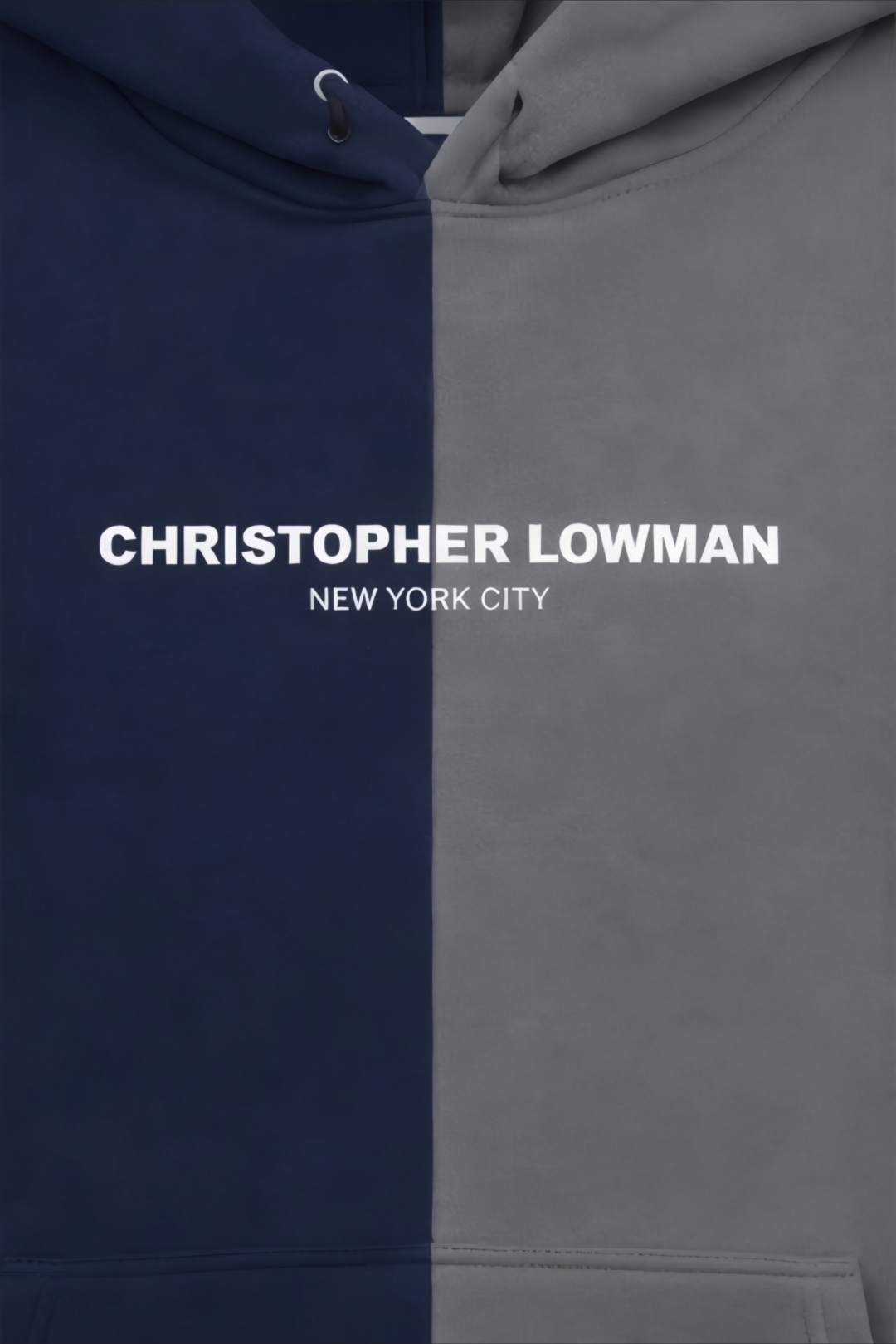A modern streetwear staple reimagined through Christopher Lowman’s signature design language. The Split Logo Hoodie features a bold two-tone construction, combining deep navy and grey panels for a clean, architectural contrast. Centered branding across the chest highlights the Christopher Lowman New York City identity, creating a statement while maintaining a refined minimal aesthetic.