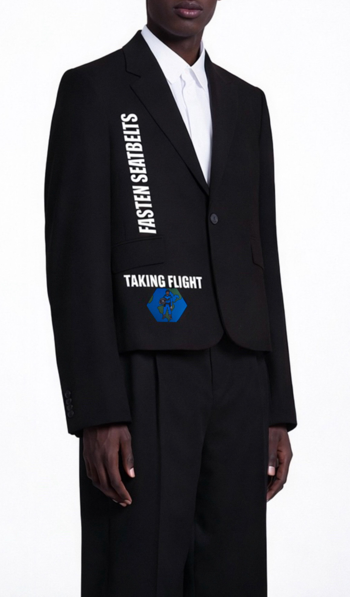 The left front panel features a vertical “FASTEN SEATBELTS” print, reinforcing the collection’s aviation narrative, while the lower front is finished with a “TAKING FLIGHT” graphic and emblem, creating a striking contrast against the minimal black base. Traditional notch lapels, a single-button closure, and clean welt pockets ground the piece in timeless tailoring, allowing the graphics to feel deliberate rather than decorative.