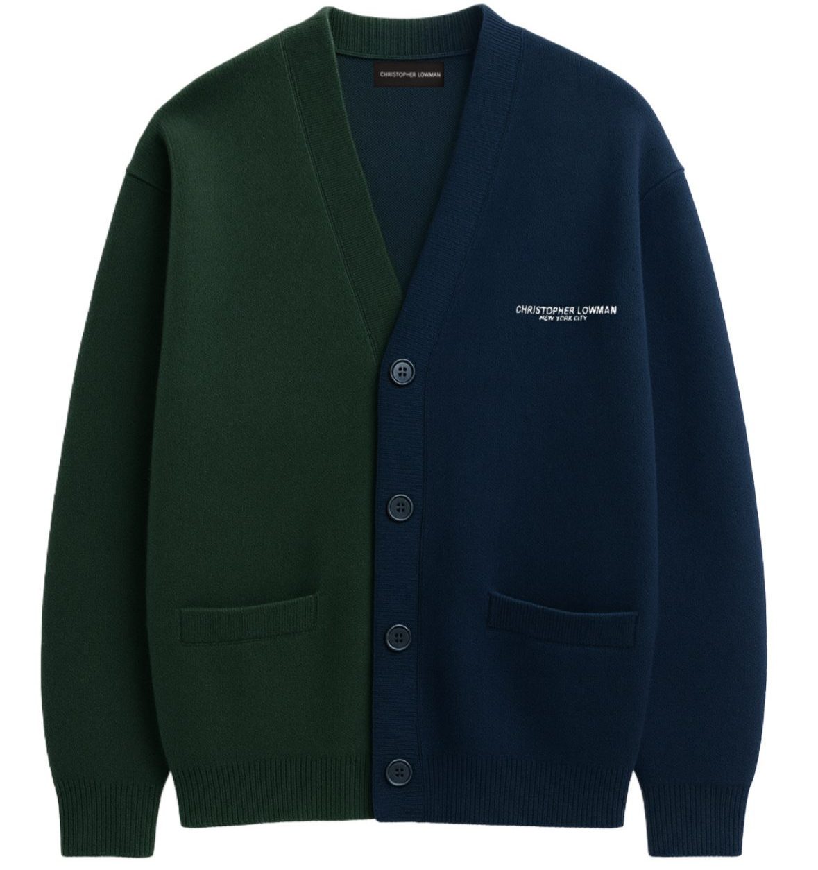 The Two-Tone Cardigan reimagines classic knitwear through a sharp, modern lens. Crafted from premium 100% wool, this cardigan features a bold two-tone color block design—deep forest green on the left, rich navy on the right—creating a striking split silhouette that feels refined yet unconventional.