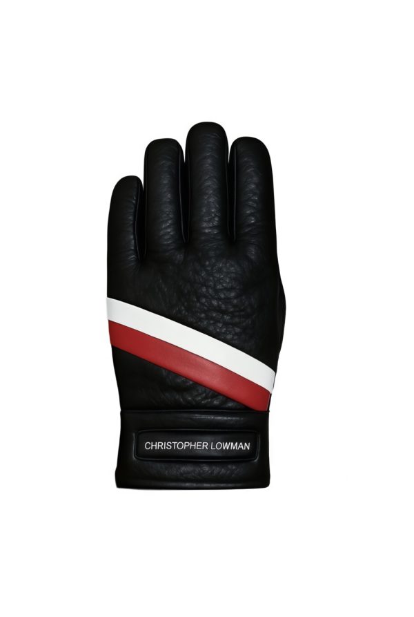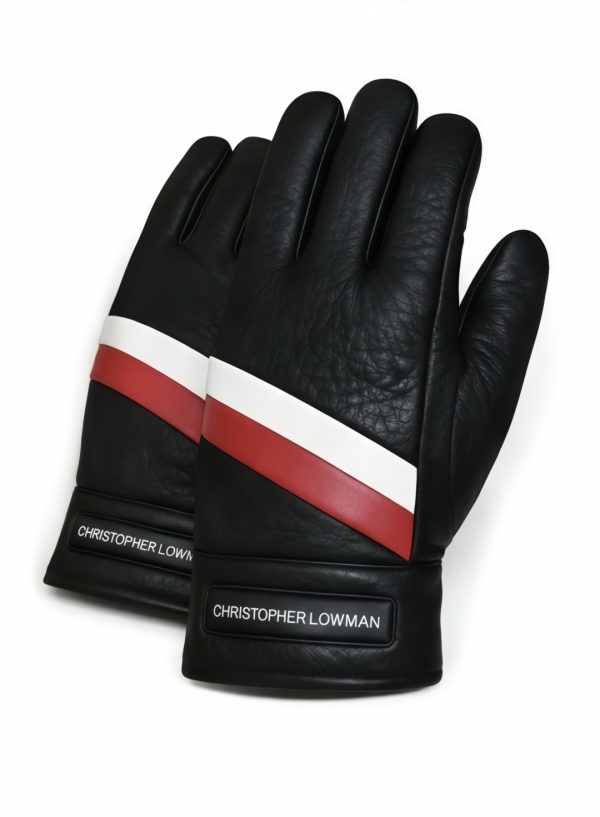 A refined expression of utility and attitude, the CHRISTOPHER LOWMAN leather glove merges classic craftsmanship with bold visual identity. Cut from supple black leather, the glove is defined by a striking diagonal stripe in red and ivory—an unmistakable signature detail that channels a modern, rock-influenced aesthetic.