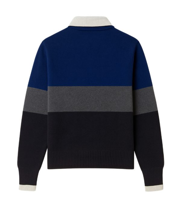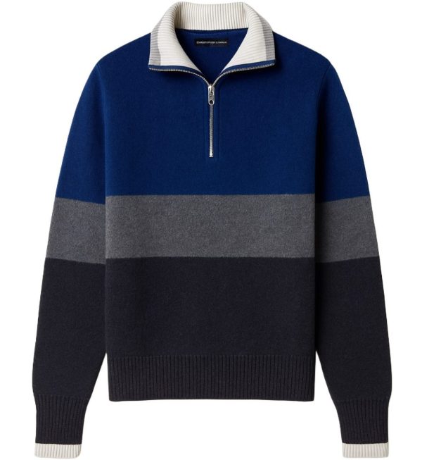 Elevate your cold-weather rotation with this refined color-block half-zip sweater, crafted from a soft, luxurious wool blend. Designed with clean lines and a modern athletic-inspired silhouette, it features bold navy, charcoal, and deep black panels for a structured, sophisticated look.