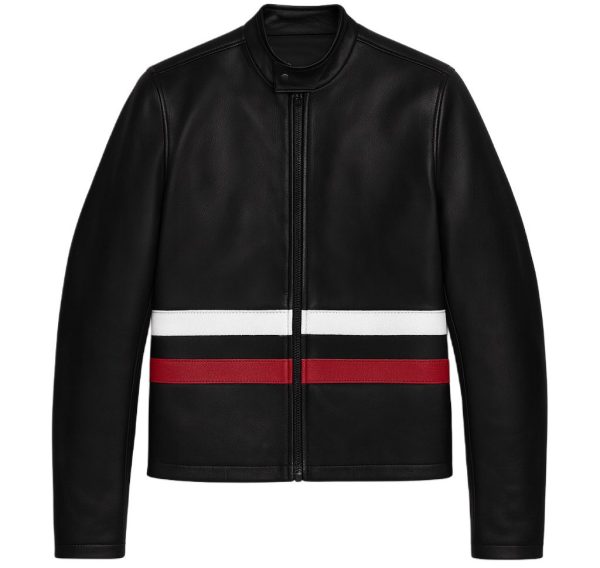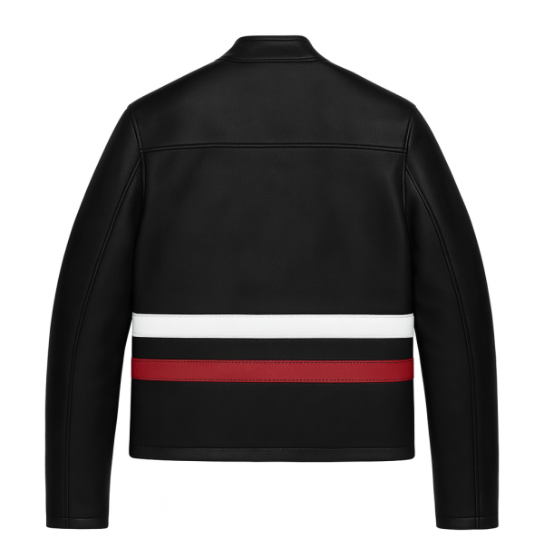 This statement leather jacket merges graphic precision with luxury craftsmanship. Cut in a cropped, structured silhouette, the jacket is constructed from smooth black leather and sharply contrasted with a white leather upper panel and bold red accents. A dynamic chevron-style red stripe runs across the chest, creating a sense of
