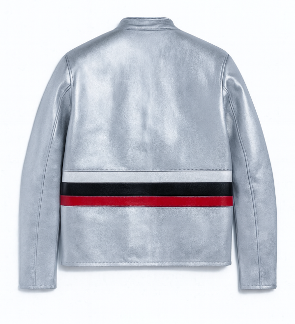 This jacket is crafted from premium metallic-finish leather and designed with a clean, modern silhouette that balances refinement with graphic precision. The smooth silver surface delivers a subtle reflective sheen, giving the piece a futuristic yet timeless presence.