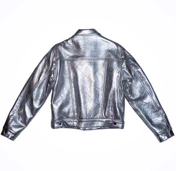 This statement jacket is crafted from metallic-finish leather, reimagining a classic trucker silhouette through a high-shine, sculptural lens. The cropped, structured shape is balanced by traditional design cues, including a pointed collar, snap-button front closure, and dual chest flap pockets. Vertical seam detailing and precise topstitching enhance the jacket’s architectural