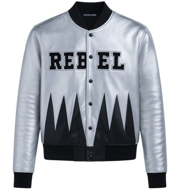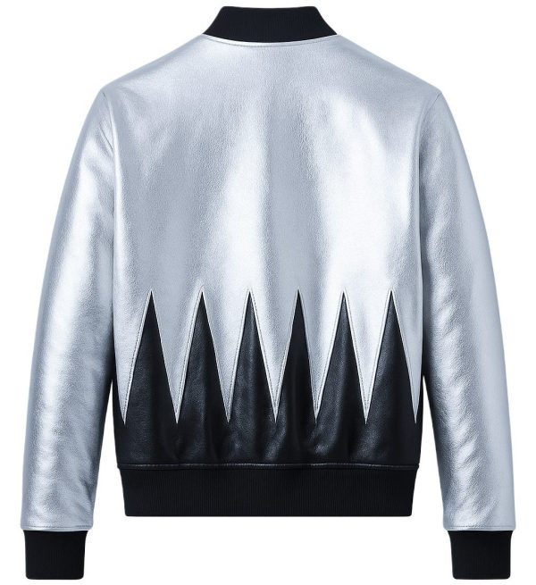 A statement varsity jacket crafted as a symbol of defiance and modern luxury. Cut from premium metallic leather, this piece reimagines classic American sportswear through a sharply graphic lens. The reflective silver body contrasts with deep black leather paneling, forming a jagged motif that cuts across the