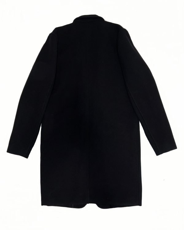 This tailored coat is crafted from Italian black brushed blended virgin wool, offering a refined balance of structure, warmth, and softness. The fabric has a smooth, lightly brushed surface that delivers a rich matte finish with subtle depth, elevating the piece while maintaining a sharp, architectural silhouette.