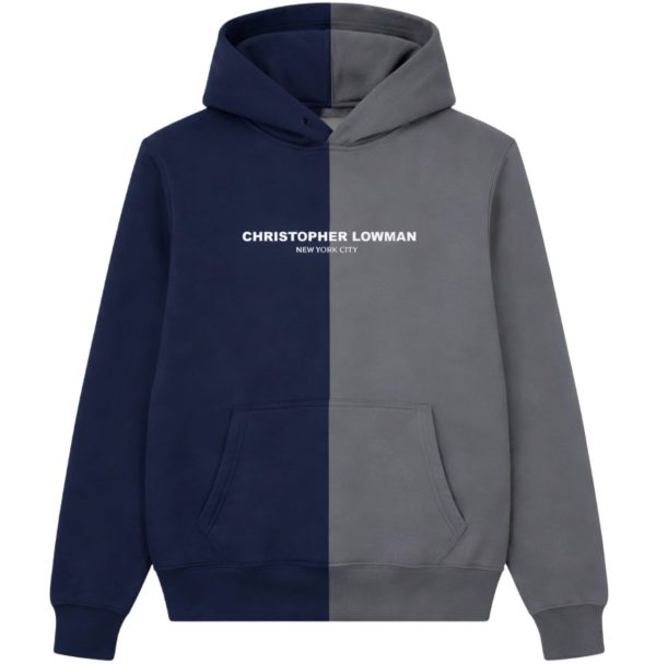Split Logo Hoodie A modern streetwear staple reimagined through Christopher Lowman’s signature design language. The Split Logo Hoodie features a bold two-tone construction, combining deep navy and grey panels for a clean, architectural contrast. Centered branding across the chest highlights the Christopher Lowman New York City identity, creating a statement while